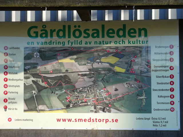 Jag behöver fördriva tiden i väntan på tåget och tittar på kartan över Gårdlösaleden. Om jag skulle göra en snabb utflykt och titta på något i närheten? Cykel har jag med mig...